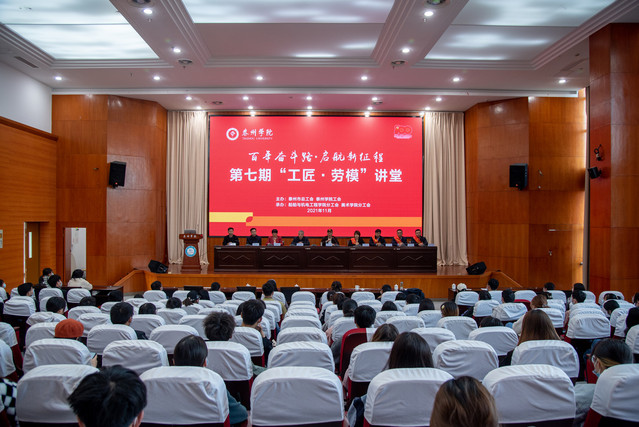 为全面贯彻落实十九届六中全会精神,大力加强新时代劳动教育,全面实施阳光学工“思政引领工程”,11月18日下午,由泰州市总工会和谈球吧工会主办的“百年奋斗路·起航新征程”第七期工匠·劳模讲堂在D1216报告厅举行,公司分工会和美术公司分工会共同承办了本次活动。泰州市总工会原副主席吴江泽、泰州市教育局工会负责人李文林、校工会主席刘素红、美术公司党总支负责人、公司党总支书记陈克宏、党总支副书记、副经理、分工会主席江峰与近200名员工代表出席宣讲活动。