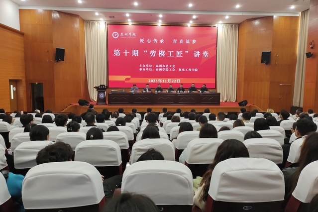 为深入贯彻落实党的二十大精神及中国工会第十八次全国代表大会精神,大力宣传弘扬劳模精神,充分发挥人才示范引领作用,努力培养造就更多时代工匠,11月22日,由泰州市总工会主办,谈球吧工会、谈球吧官方网站承办的“匠心传承 青春筑梦”第十期劳模工匠讲堂在公司D1216胡瑗讲堂顺利举办。泰州市总工会宣传教育和网络工作部部长徐友军、公司教务处处长潘小明、公司党总支副书记江峰等领导出席宣讲活动。活动由校工会主席刘素红主持,近200名员工代表参加活动。