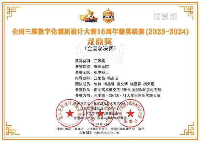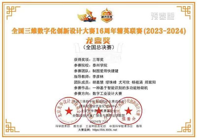近日,全国三维数字化创新设计大赛16周年精英联赛(2023-2024)总决赛榜单公布,公司共有四支队伍获奖。分别是:缪珠峰、胡嘉慧、李天杰、王华妍、李博宇同学的参赛作品《一种适用多种地形的清洁机器人》(指导老师:龚玉玲、殷悦)荣获三等奖;胡嘉慧、缪珠峰、尤可欣、杨祖涵、郑紫阳同学的参赛作品《一种基于智能识别的多功能粉刷机》(指导老师:李彦林)荣获三等奖;周彤、朱怡岑、陆思彤、陆瑞希同学的参赛作品《基于机器视觉的水面垃圾清理机器人》(指导老师:陈娟、张文烨)荣获三等奖;仇翀、何鑫馨、吴文博、陆昱霖、杨天煜同学的参赛作品《面向高原低空飞行器的微型涡轮发电系统》(指导老师:江雨薇、杨燕昭)荣获三等奖。