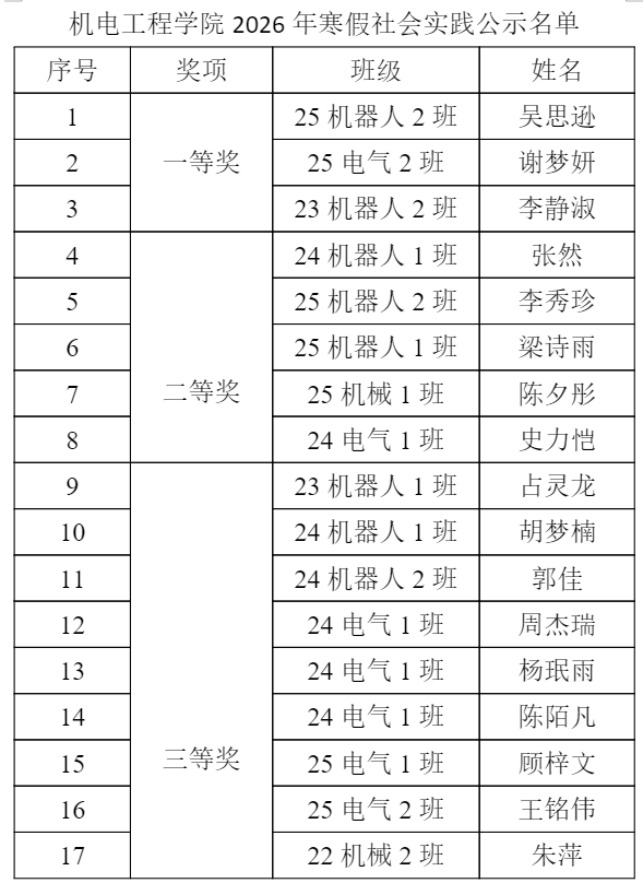 本次活动以“看家乡发展、探企业需求、立就业初心”为核心,围绕公司机械设计制造及其自动化、电气自动化等核心专业方向,引导学子们走进家乡与专业高度契合的企业和工厂,同时鼓励学子走进红色教育基地、社区,将专业实践与家乡发展调研相结合。为表彰先进、树立榜样,公司对学子们的实践成果进行综合评审,最终评选出优秀寒假社会实践先进个人共17人,其中一等奖3人、二等奖5人、三等奖9人。获奖学子们的实践报告内容翔实、感悟深刻,不仅展现了扎实的专业认知,更表达了对家乡发展的认可与返乡就业的期待。