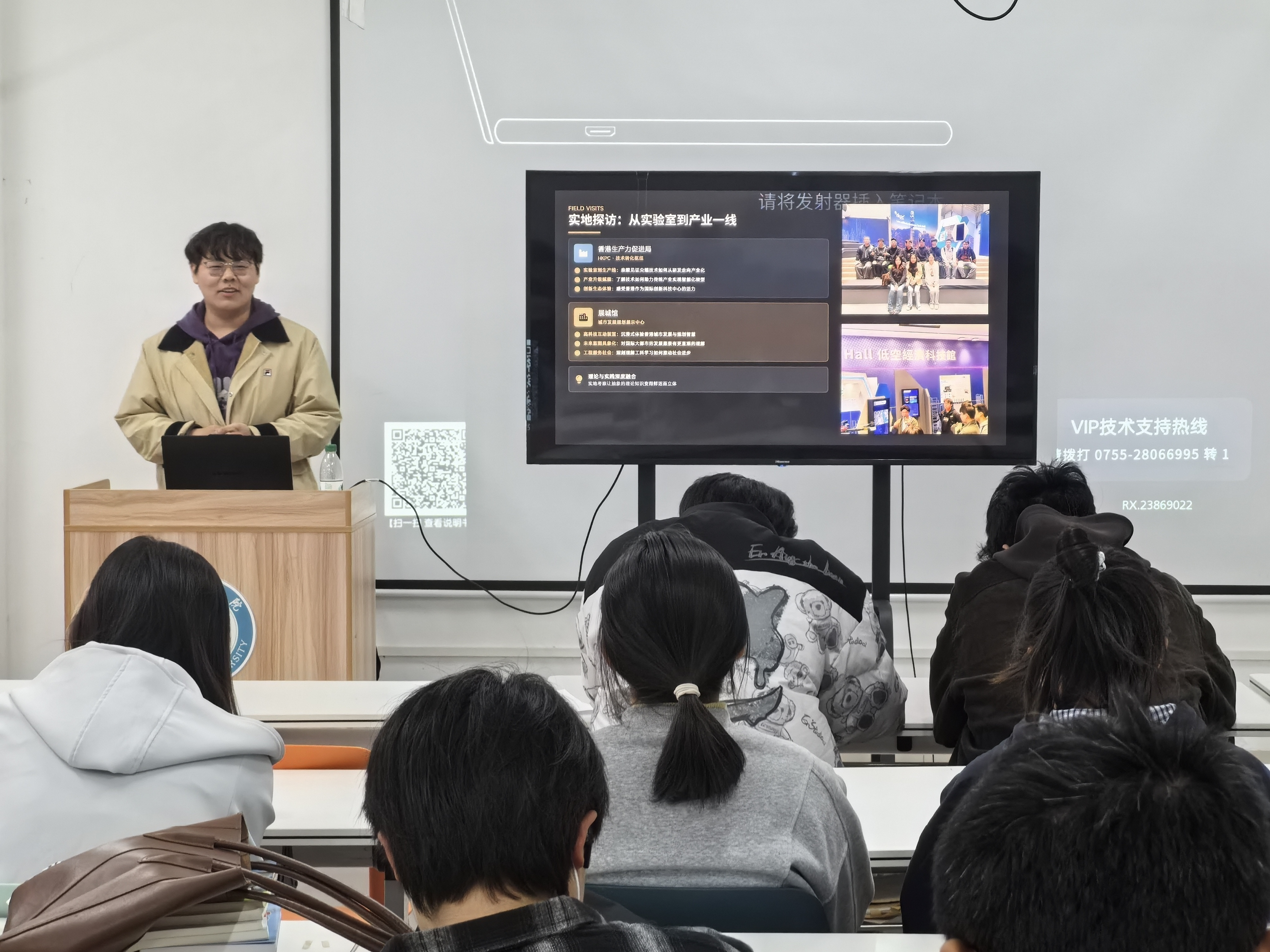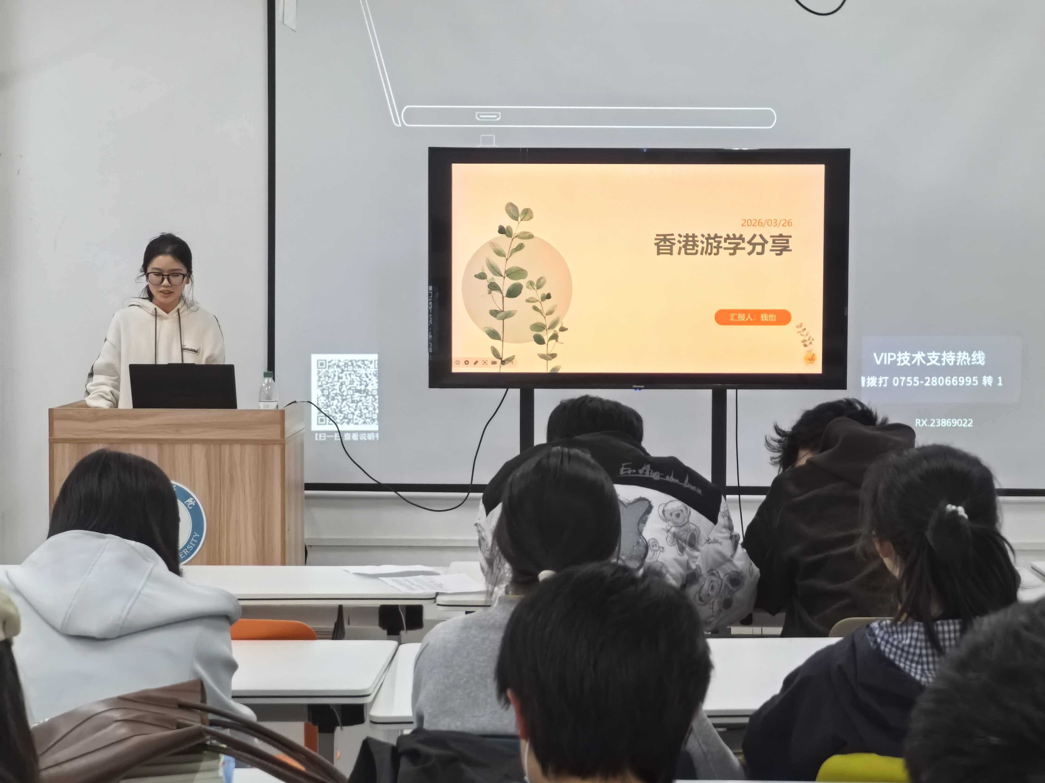 活动中,学子们结合赴香港理工大学访学经历,围绕课程学习、专业提升、跨文化体验等内容展开交流。王树麟以“城市底色”为切入点,分享香港中西交融的城市气质与文化观察;朱泳健聚焦实地探访环节,生动还原了走进香港生产力促进局、展城馆的见闻与产业思考;王敏洁则重点介绍在尖沙咀乘船赏维港风光、感受旺角市井烟火、漫步中环都市繁华的游历体验;钱怡以游学中的生活与成长为主线,讲述了春节舞狮等文化浸润片段等。